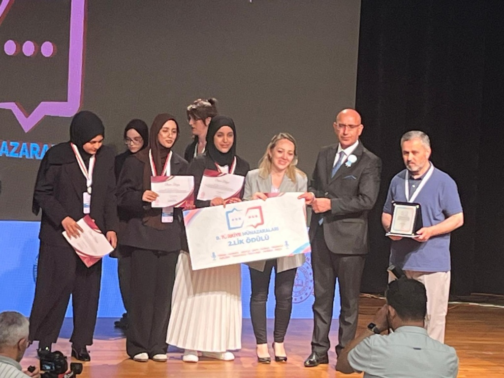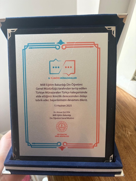 Milli Eğitim Bakanlığı Din Öğretimi Genel Müdürlüğü tarafından bu yıl 8.si düzenlenen Türkiye Münazaraları yarışmasında okulumuz Uluslarası öğrenciler münazara takımı Türkçe kategorisinde Türkiye 2.si olmuştur. Danışman öğretmenimiz Betül ÖZTÜRK POLAT’ ı ve öğrencilerimizi tebrik ediyoruz.