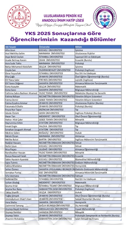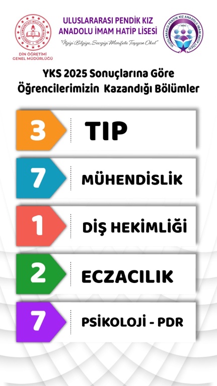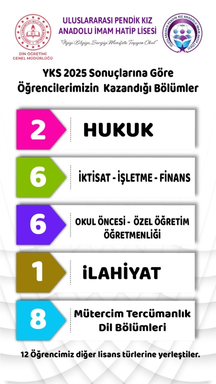 2025 YILI YKS YERLEŞME SONUÇLARI AÇIKLANDİ. YÜKSEK ÖĞRETİM KURUMLARINA YERLEŞMİŞ OLAN TÜM ÖĞRENCİLERİMİZİ TEBRİK EDERİZ. BU BAŞARIDA EMEĞİ GEÇEN TÜM ÖĞRETMEN VE İDARECİLERİMİZE TEŞEKKÜR EDERİZ...